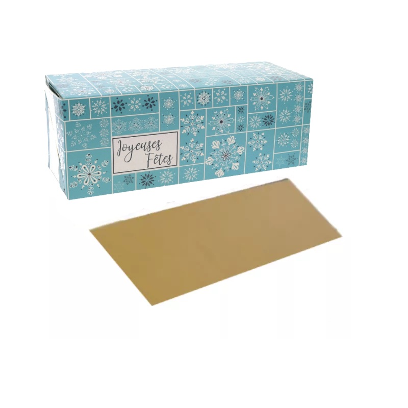 Avec son décor hivernal bleu pastel agrémenté de flocons, cette boîte apporte fraîcheur et douceur aux présentations de fin d’année. Son format de 30 cm est idéal pour accueillir une bûche familiale de 6 à 8 parts. La semelle dorée fournie assure stabilité, hygiène et mise en valeur de vos desserts, tout en facilitant les manipulations.