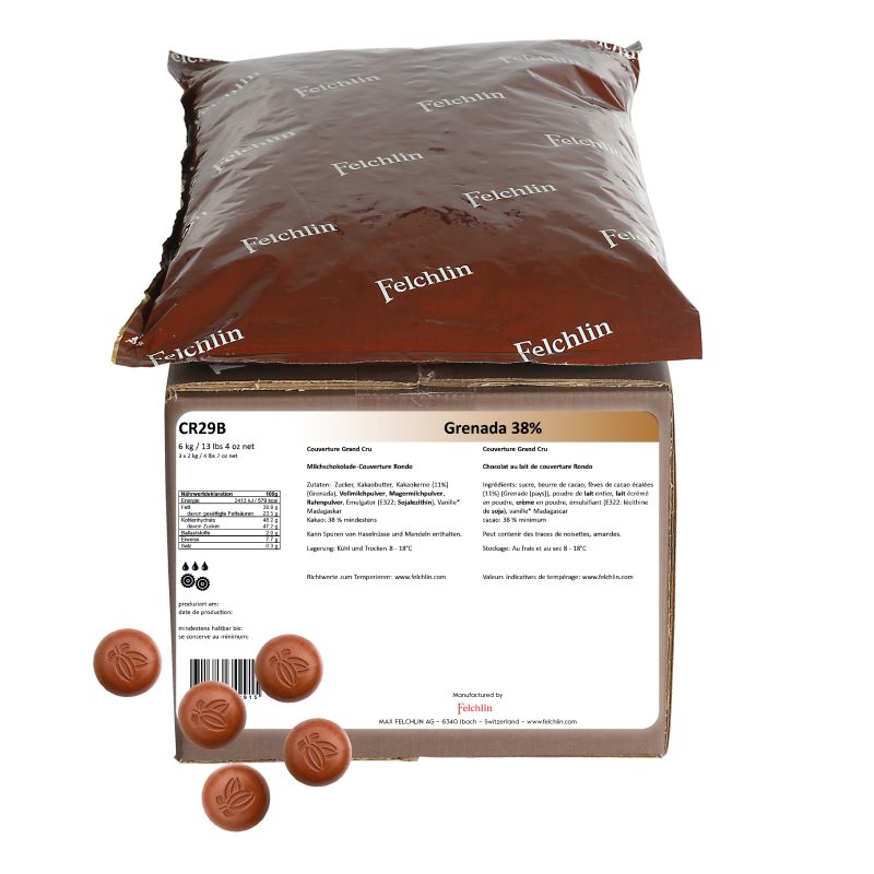 Le chocolat Grenada 38 % est un chocolat au lait haut de gamme fabriqué en Suisse, avec 11 % de cacao d’origine Grenade. Sa douceur lactée équilibrée par une note cacao subtile en fait un choix parfait pour l’enrobage de pralinés, le moulage de corps creux, la réalisation de ganaches, mousses et crèmes. Riche et raffiné, il est certifié Halal et Kasher Dairy, et contient 38 % de cacao minimum.