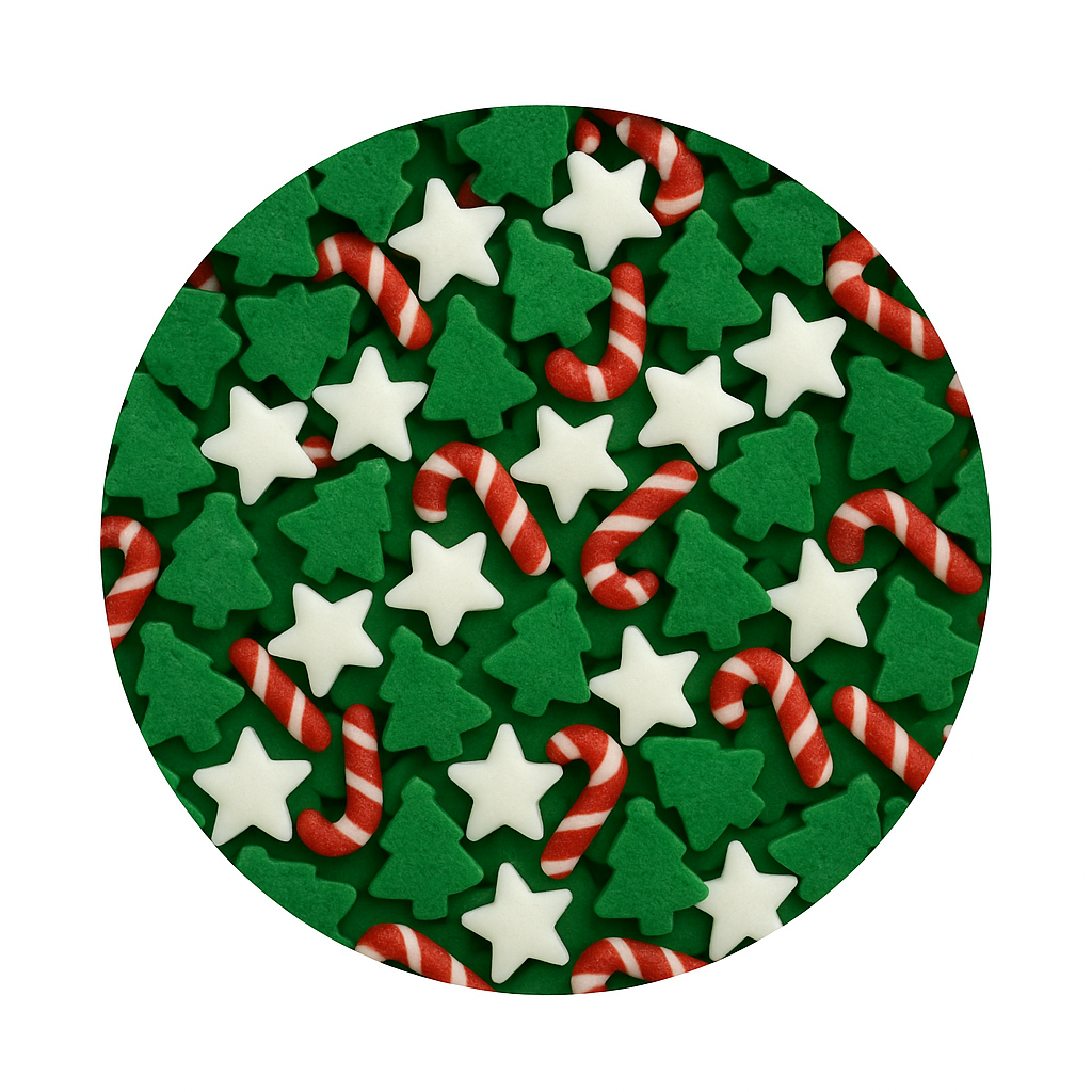 Chaque sachet contient 100 grammes d’un assortiment festif de formes emblématiques de Noël : de fines étoiles dorées, des sapins verts éclatants et des cannes en sucre d’orge rayées, prêtes à égayer toutes vos préparations. Leur texture légèrement croquante apporte également une touche agréable sous la dent, en complément des saveurs de vos desserts.