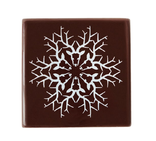 L’embout de bûche de Noël arbore un magnifique flocon de neige créé par 6 têtes de cerfs délicatement dessinées. Le contraste entre le chocolat noir profond et les détails argentés du motif offre une finition à la fois chic et festive, parfaite pour sublimer vos desserts de fête.