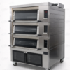 Four à soles Ramalhos MODULRAM avec dalles 0,94 × 1,20 m et 3 étages : 2 chambres 160 mm + 1 chambre 260 mm. Chaque étage est équipé d’un bac à buée. Ensemble complet avec hotte à extraction et étuve 3 niveaux (H = 650 mm). Alimentation 400V 3N~, 16,5 kW, IPX4.
